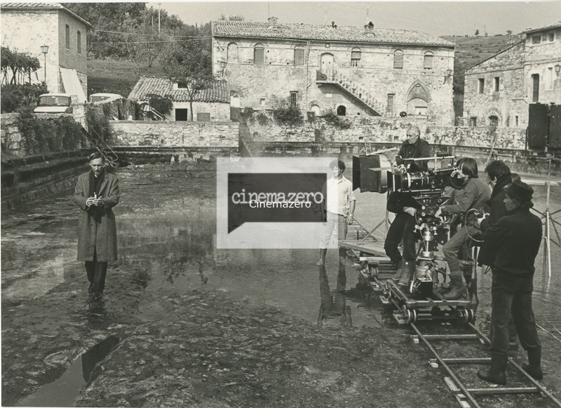 Andrei Tarkovskij alla camera mentre Oleg Yankovskiy (Andrei Gorciakov) attraversa con la candela accesa la piscina di Santa Caterina di Bagni Vignoni , campo lungo, foto di set