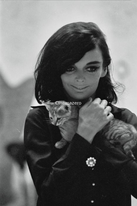 L'attrice Barbara Steele, interprete del ruolo di Gloria Morin, ritratta sorridente mentre tiene tra le braccia un gattino.