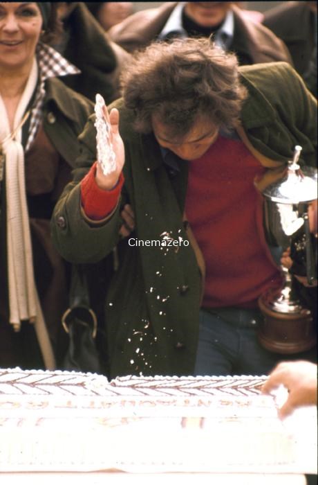 Il regista Bernardo Bertolucci ritratto mentre, reggendo la coppa vinta nella sfida calcistica tra la sua troupe e quella di Pier Paolo Pasolini, è intento a tagliare con la mano sinistra la torta che ha davanti. I presenti assistono alla scena.