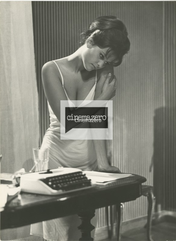 Claudia Cardinale appoggiata ad una scrivania con una macchina da scrivere,...