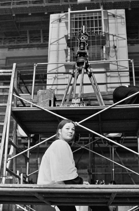 La fotografa di scena Deborah Beer ritratta seduta sopra un'impalcatura. Poco più in alto, posizionata su un treppiede, la macchina da presa.