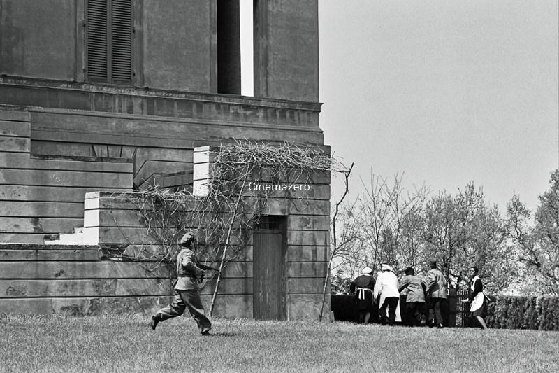 Ezio, un Collaborazionista, è intento a correre - il mitra alla mano - verso un angolo della Villa delle sevizie, mettendo in fuga la Servitù scoperta a spiare la scena in corso (fuori campo) nel cortile antistante l'edificio. Mentre il resto del gruppo si affretta a defilarsi, la Serva negra indugia a guardare il Milite.