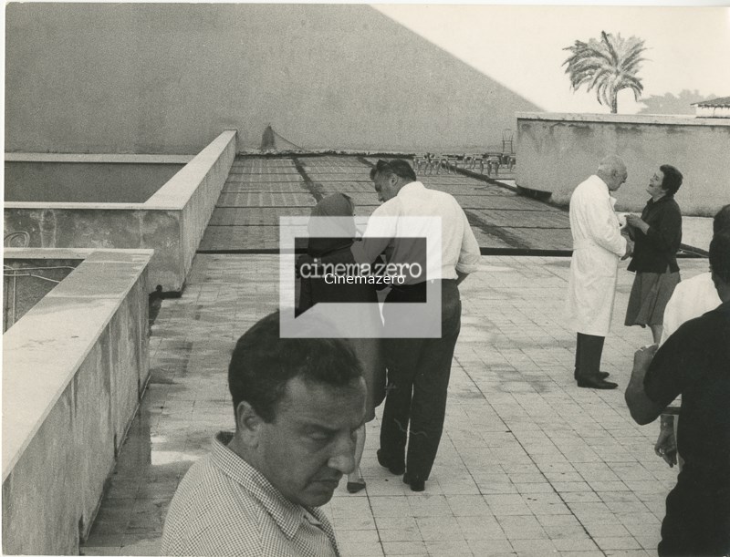 Federico Fellini dà indicazioni sul set, figura intera, foto di set