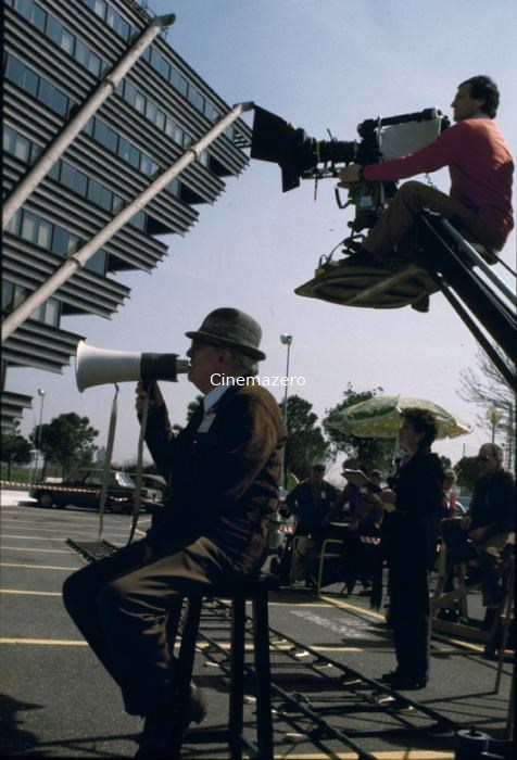 Federico Fellini ritratto sul set mentre, un megafono in mano, è intento a dirigere la scena (fuori campo) di cui sono in corso le riprese. Intorno al regista, i suoi collaboratori.