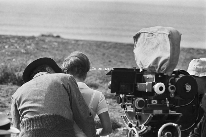 Set: il regista Federico Fellini ritratto (di spalle) accanto alla macchina da presa in compagnia dell'attrice Claudia Cardinale, interprete del ruolo di Claudia.