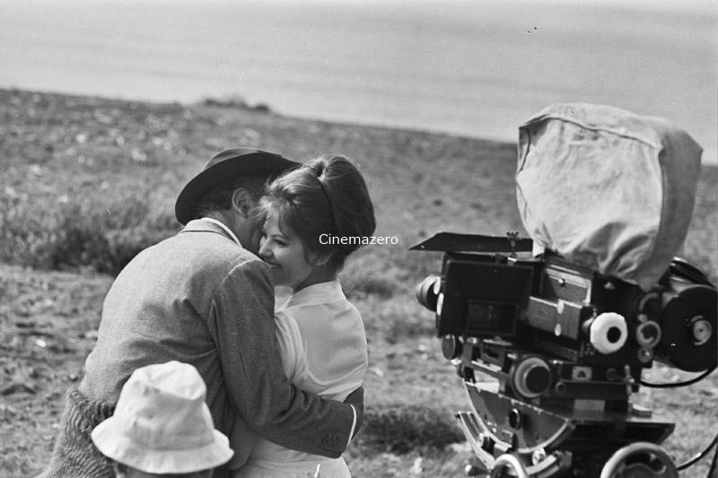 Set: il regista Federico Fellini ritratto davanti alla macchina da presa mentre abbraccia l'attrice Claudia Cardinale, interprete del ruolo di Claudia.