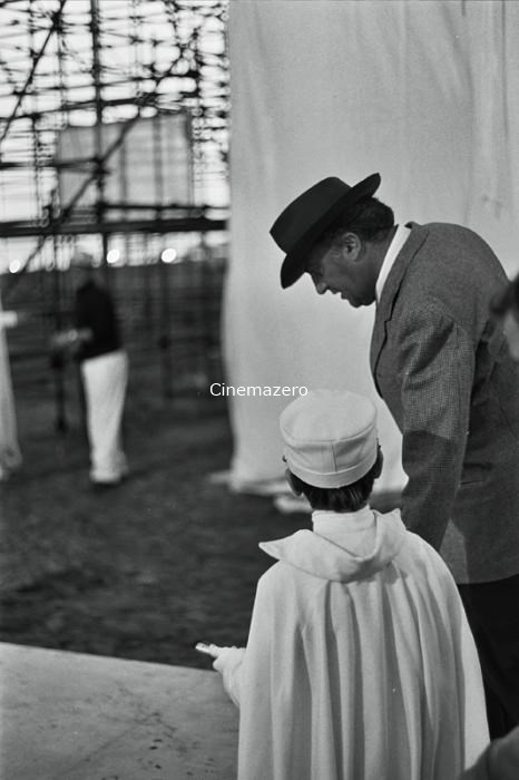 Il regista Federico Fellini ritratto sul set mentre è intento a dare indicazioni a Riccardo Guglielmi (di spalle), il bambino che interpreta il ruolo del Piccolo Guido. Sullo sfondo si indovina la struttura dell'astronave.