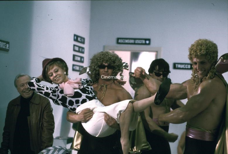 Ginger (Giulietta Masina) ritratta in un corridoio degli Studi del Centro Spaziale Televisivo mentre, in braccio ad uno dei Culturisti ivi presenti, posa per una fotografia sotto lo sguardo del vecchio amico Toto (Toto Mignone).