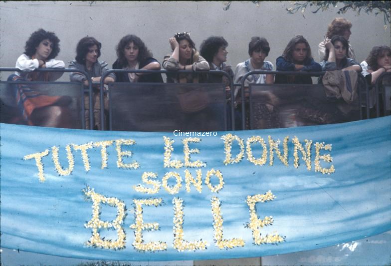 In un salone del Grand Hotel Miramare un gruppo di Femministe è impegnato a seguire una conferenza a tema da un ballatoio al quale è appeso uno striscione che recita: "Tutte le donne sono belle".
