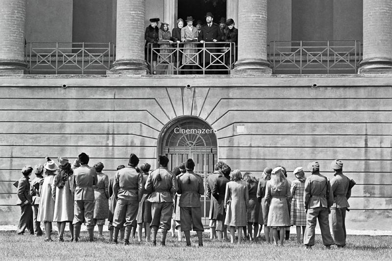 I prigionieri ritratti mentre, radunati - sotto la sorveglianza di Collaborazionisti e Camice Nere - nel cortile antistante la Villa delle sevizie, sono intenti ad ascoltare il discorso pronunciato, dall'alto di una loggia, dai Signori loro carcerieri. In compagnia di questi, le Narratrici - la Sig.ra Maggi (Elsa De Giorgi), la Sig.ra Vaccari (Hélène Surgère) e la Sig.ra Castelli (Caterina Boratto) - e la Pianista (Sonia Saviange) loro complici.