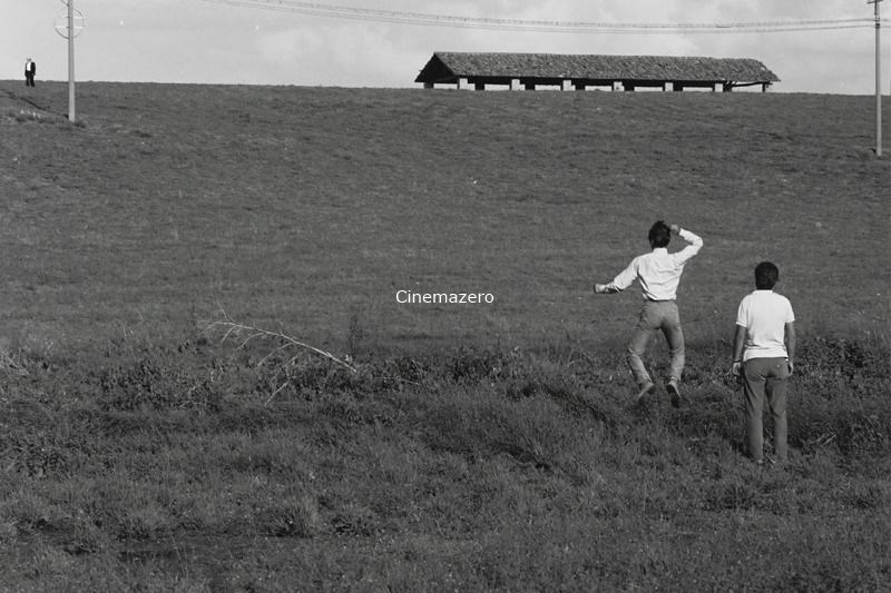 Il regista Pier Paolo Pasolini ritratto (di spalle) sul set insieme ad una collaboratrice mentre è intento a saltare per meglio vedere la scena in corso in cima alla collina che ha di fronte.
