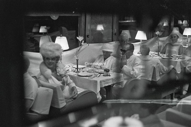 I conoscenti/personaggi del film del regista Guido Anselmi (Marcello Mastroianni) ritratti mentre, ciascuno con un abito bianco indosso, siedono a tavola nel Vagone Ristorante di un treno.