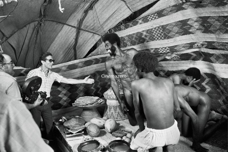 Il regista Pier Paolo Pasolini ritratto mentre, in piedi accanto ad un collaboratore che regge la macchina da presa, è intento a dare indicazioni ad uno degli attori coinvolti in una scena ambientata nella Tenda di Abu Nawàs.