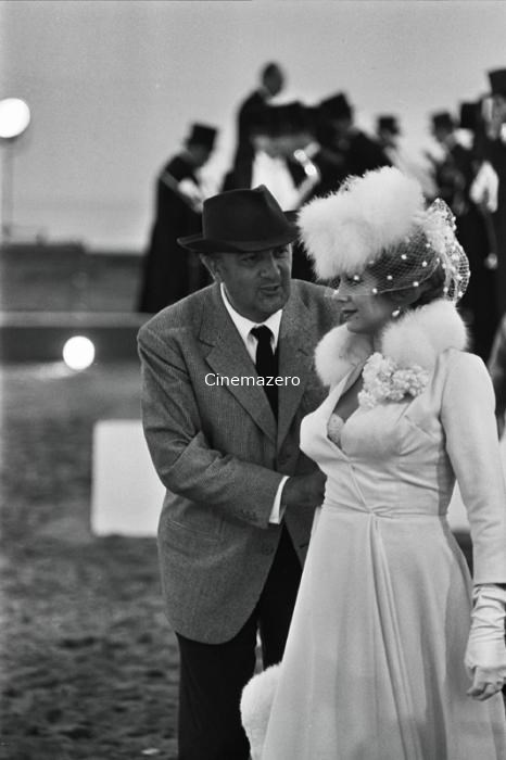 Il regista Federico Fellini ritratto sul set mentre è intento a dare indicazioni all'attrice Sandra Milo, interprete del ruolo di Carla. Sullo sfondo si indovinano le sagome degli orchestrali.