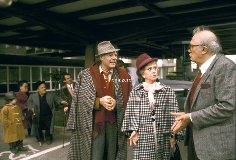 Il regista Federico Fellini ritratto sul set mentre è intento a dare indicazioni agli attori Giulietta Masina e Marcello Mastroianni, interpreti rispettivamente del ruolo di Ginger e di quello di Fred. Sullo sfondo, fuori fuoco, alcuni nani.