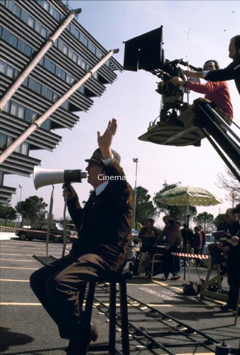 Federico Fellini ritratto sul set mentre, un megafono in mano, è intento a dirigere la scena (fuori campo) di cui sono in corso le riprese. Intorno al regista, i suoi collaboratori.