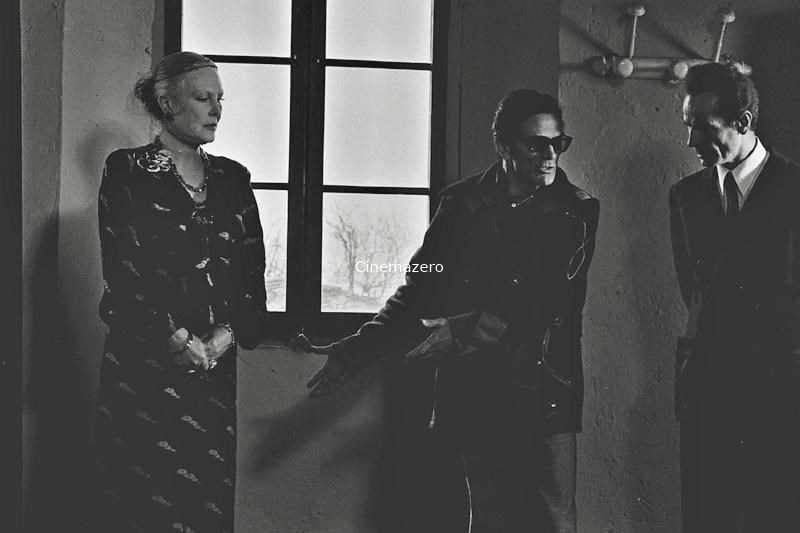 Il regista Pier Paolo Pasolini ritratto sul set mentre, sotto lo sguardo dell'attrice Caterina Boratto, dà indicazioni ad Aldo Valletti, interprete del ruolo del Presidente.