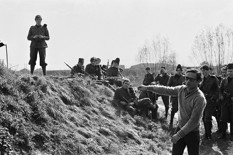 Pier Paolo Pasolini ritratto sul set mentre è intento a dare indicazioni agli attori coinvolti nella scena, nel ruolo di Camice Nere.