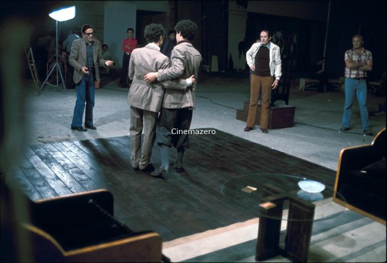 Teatro di posa: Pier Paolo Pasolini ritratto mentre, sotto lo sguardo di vari membri della troupe, è intento a dare indicazioni a due attori intenti a provare la scena finale del ballo dei Collaborazionisti. Alle spalle del regista, un riflettore acceso.