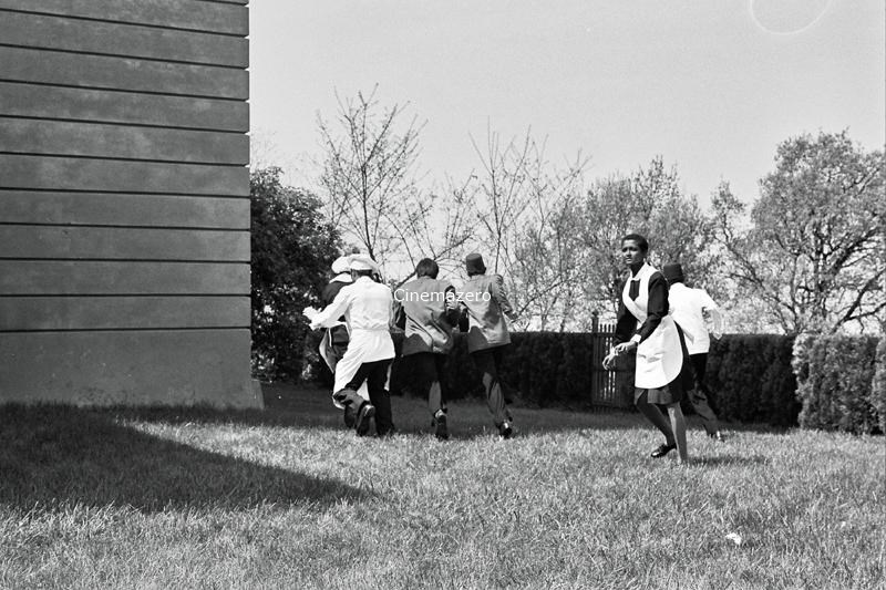 La Servitù della Villa delle sevizie ritratta mentre, sorpresa in cortile a spiare la scena in corso (fuori campo), è intenta a defilarsi dietro l'angolo dell'edificio. In fondo al gruppo in fuga, la Serva negra, che indugia a guardare un soggetto fuori campo.