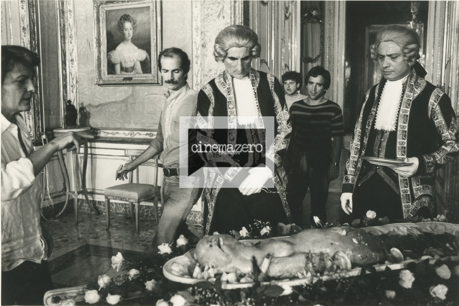 Liliana Cavani dà indicazioni sul set a tecnici e attori non identificati, mezza figura, foto di set, “Cena di Benvenuto”