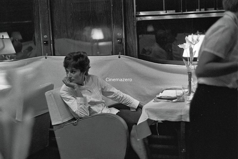 Luisa Anselmi (Anouk Aimée) ritratta mentre, lo sguardo rivolto indietro, siede al tavolo del Vagone Ristorante di un treno.