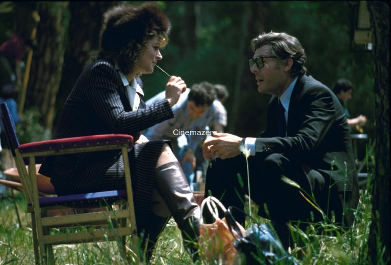 Set: gli attori Marcello Mastroianni e Bernice Stegers, interpreti rispettivamente del ruolo di Snàporaz e di quello della Donna del treno, ritratti mentre conversano tra loro durante una pausa.