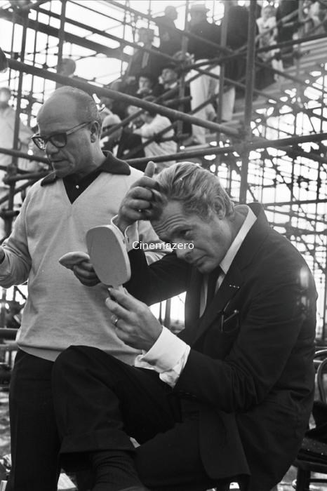 Set: Marcello Mastroianni, interprete del ruolo di Guido Anselmi, ritratto accanto al truccatore mentre è intento a guardarsi ad uno specchio. Alla destra dell'attore, in attesa dell'inizio delle riprese sulle scale dell'astronave, i colleghi con lui coinvolti nella scena finale.
