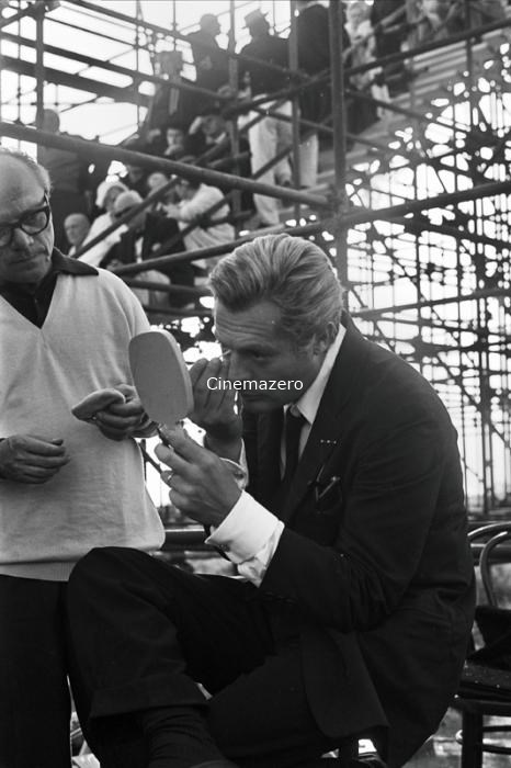 Set: Marcello Mastroianni, interprete del ruolo di Guido Anselmi, ritratto mentre è intento a truccarsi davanti ad uno specchio. Alla destra dell'attore, in attesa dell'inizio delle riprese sulle scale dell'astronave, i colleghi con lui coinvolti nella scena finale.