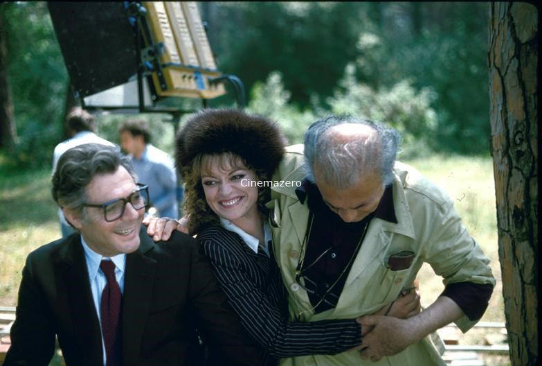 Il regista Federico Fellini ritratto sul set in compagnia degli attori Marcello Mastroianni e Bernice Stegers, interpreti rispettivamente del ruolo di Snàporaz e di quello della Donna del treno.