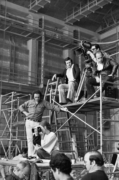 Il regista Pier Paolo Pasolini ritratto sopra un'impalcatura mentre, affiancato da due collaboratori, è impegnato nelle riprese della scena in corso di fronte a lui (fuori campo). Tra gli altri membri della troupe presenti, seduta poco più in basso, la fotografa di scena Deborah Beer.