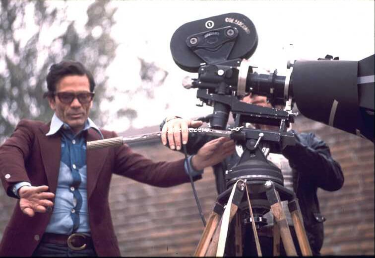Pier Paolo Pasolini ritratto dietro la macchina da presa mentre è intento a dare indicazioni ad un soggetto fuori campo. Accanto al regista, un suo collaboratore.