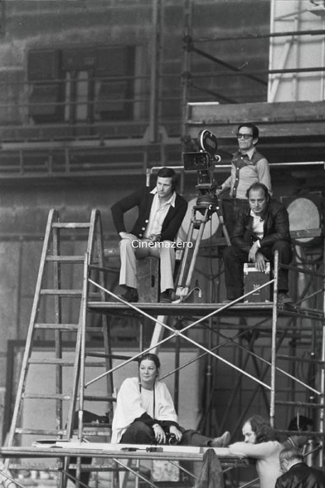 Il regista Pier Paolo Pasolini ritratto sopra un'impalcatura mentre, affiancato da due collaboratori, attende dietro la macchina da presa di cominciare le riprese. Seduta poco più in basso, la fotografa di scena Deborah Beer.