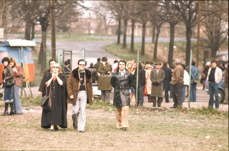 Il regista Pier Paolo Pasolini ritratto mentre fa il suo ingresso, in compagnia di Laura Betti e di altri due amici, nel campo in cui si è disputata la sfida calcistica tra i membri della propria troupe e quelli della troupe del film "Novecento", diretto da Bernardo Bertolucci.