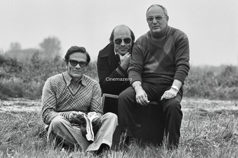 Il regista Pier Paolo Pasolini, lo scenografo Dante Ferretti e il direttore della fotografia Tonino Delli Colli ritratti sul set durante una pausa.