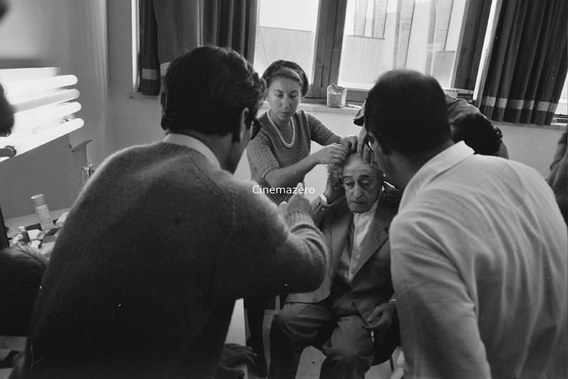 Il regista Pier Paolo Pasolini ritratto (di spalle) in sala trucco mentre è intento a dare delle indicazioni ai tecnici impegnati nell'elaborazione dell'acconciatura di Totò, interprete del personaggio di Ciancicato Miao.