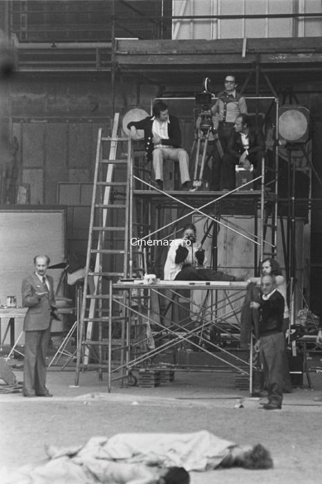 Il regista Pier Paolo Pasolini ritratto sopra un'impalcatura mentre, affiancato da due collaboratori, si prepara a cominciare le riprese di una scena ambientata nel Cortile della Villa. Tra gli altri membri della troupe presenti, seduta in basso sull'impalcatura, la fotografa di scena Deborah Beer.