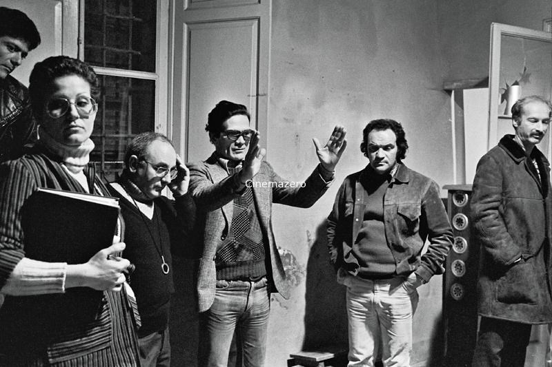 Pier Paolo Pasolini ritratto insieme ad attori e collaboratori durante i preparativi per le riprese di una scena ambientata nel Ripostiglio della Villa delle sevizie Alla destra del regista, in piedi accanto alla porta della stanza, l'attore Uberto Paolo Quintavalle, interprete del ruolo di Sua Eccellenza; alla sua sinistra, il direttore della fotografia Tonino delli Colli e la segretaria di edizione Beatrice Banfi.