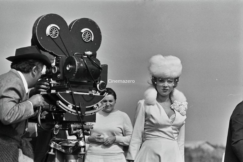 Set: il regista Federico Fellini ritratto alla macchina da presa mentre, affiancato da un suo collaboratore, è intento a riprendere l'attrice Sandra Milo, interprete del ruolo di Carla.
