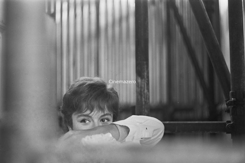 L'attrice Anouk Aimée, interprete del ruolo di Luisa Anselmi, ritratta all'interno di un casotto di lamiera.