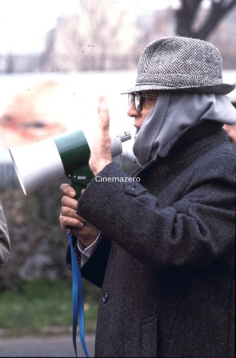 Il regista Federico Fellini ritratto sul set mentre, un megafono in mano, è intento a dare indicazioni a dei soggetti fuori campo.