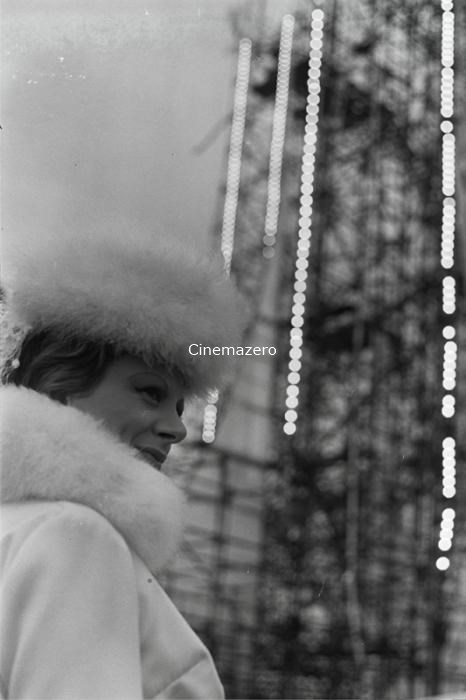 L'attrice Sandra Milo, interprete del ruolo di Carla, ritratta sorridente sul set con il costume di scena indosso. Sullo sfondo è visibile la struttura dell'astronave (fuori fuoco).