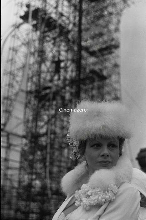 L'attrice Sandra Milo, interprete del ruolo di Carla, ritratta sul set con il costume di scena indosso. Sullo sfondo è visibile la struttura dell'astronave (fuori fuoco).
