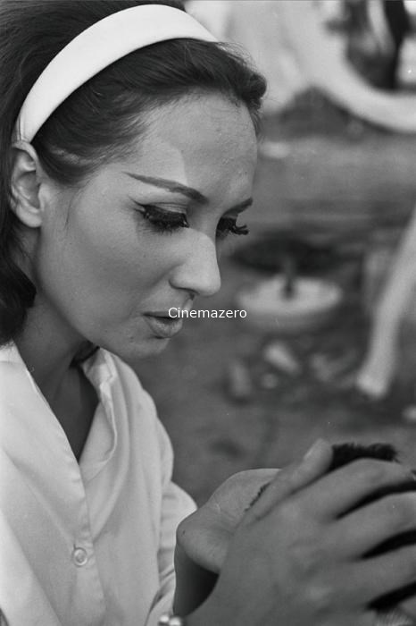 Un'attrice ritratta mentre è intenta ad accarezzare un cucciolo.