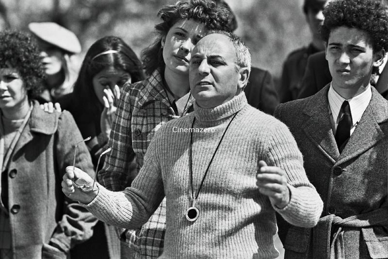 Il direttore della fotografia Tonino Delli Colli ritratto al lavoro sul set. Intorno a lui, gli attori coinvolti nella scena.