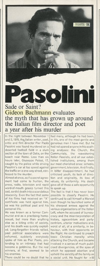 Pasolini : Sade or Saint? : Gideon Bachmann evaluates the myth that has grown up around the Italian film director and poet a year after his murder