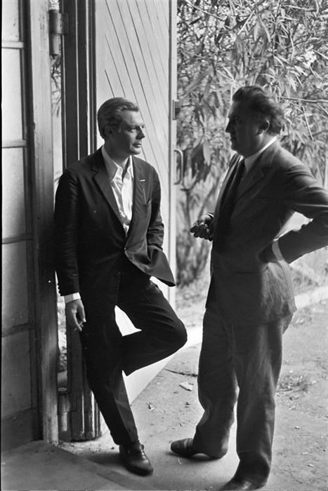 Il regista Federico Fellini ritratto mentre conversa con l'attore Marcello...